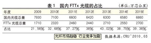 CRU還預測中國2010年、2011年、2012年、2013年、2014年、2015年光纜總的需求量分別為7100萬芯公里、6600萬芯公里、6420萬芯公里、6300萬芯公里、6580萬芯公里、6860萬芯公里,預測中國2010年、2011年、2012年、2013年、2014年、2015年應用于FTTx的光纜需求量分別為2320萬芯公里、2460萬芯公里、2440萬芯公里、2710萬芯公里、2550萬芯公里、2700萬芯公里。從表1可以看到,盡管國內(nèi)光纜需求在2009年“爆發(fā)”以后,有一個消化的過程,但FTTx的占比呈增長態(tài)勢。因此,烽火通信堅定看好FTTx光纜市場發(fā)展。