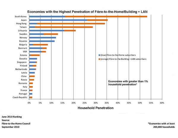 本月在拉斯維加斯舉辦的2010 FTTH研討會暨展覽會上,F(xiàn)TTH Council宣布了最新的FTTH/FTTB滲透率排名,總共24個經(jīng)濟體(FTTH/FTTB家庭滲透率至少超過1%)入圍排名。就G-20國家來看,此次的排名跟去年年底的調查一樣,有7個G-20國家在名單之內,包括:南韓、日本、美國、中國、俄羅斯、意大利和法國。南韓保持其全球FTTH/FTTB滲透率領先的地位,截止2010年6月,其滲透率已經(jīng)超過50%。同時,一些東歐經(jīng)濟體,尤其是立陶宛、斯洛文尼亞、愛沙尼亞和保加利亞,這些國家FTTH滲透率正在持續(xù)擴大。