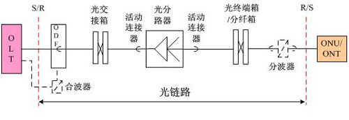 ODN的光功率預(yù)算所容許的損耗定義為S/R和R/S(S: 光發(fā)信參考點(diǎn)、R:光收信參考點(diǎn))參考點(diǎn)之間的光損耗,以dB表示。這一損耗包括了光纖和無(wú)源光元件(例如光分路器、活動(dòng)連接器和光接頭等)所引入的損耗。ODN的容許損耗值對(duì)下行和上行方向是相同的。