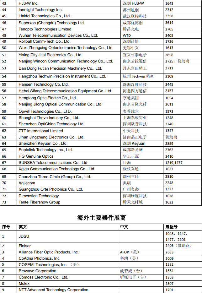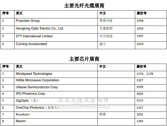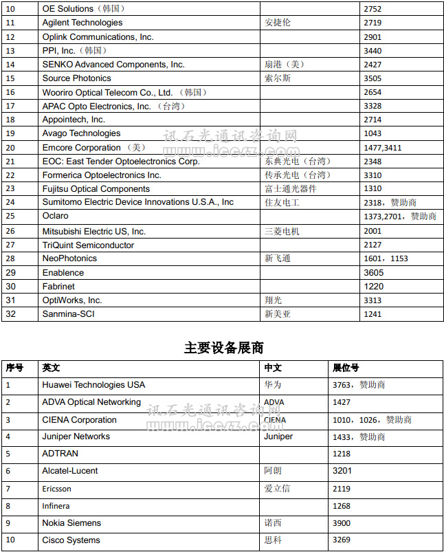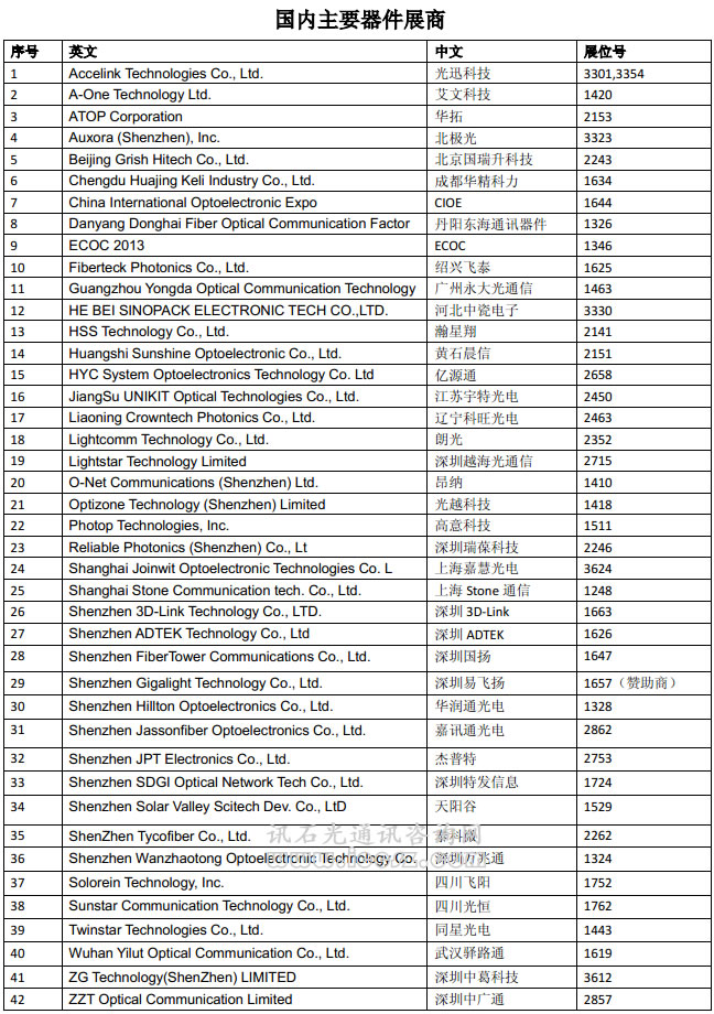 【訊石光通訊咨詢網(wǎng)】OFC 2013即將于下周在美國開幕,據(jù)訊石了解本次國內(nèi)外光通訊展商有五百五余家,其中國內(nèi)企業(yè)有七十多家。訊石特整理主要的參展商名單信息,展商覆蓋從器件商到設備商,再到光纖光纜和芯片廠商,以供業(yè)界查詢使用。本屆OFC2013熱點將集中在:云計算和數(shù)據(jù)中心網(wǎng)絡,空分復用,100G/400G網(wǎng)絡設計和優(yōu)化,1Tb和超光網(wǎng)絡,靈活網(wǎng)格狀網(wǎng)絡,波長敏捷接入網(wǎng)絡,虛擬化和SDN,相干探測,高速光子集成,光和無線網(wǎng)絡的融合等。