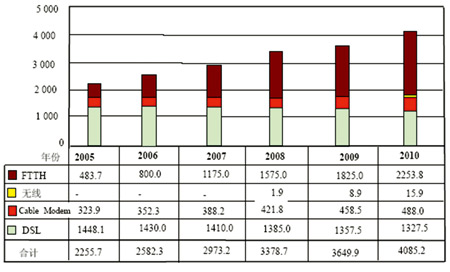 以EPON和GPON為代表的光接入技術(shù)產(chǎn)業(yè)鏈逐步成熟,技術(shù)和產(chǎn)品不斷完善,光纖接入網(wǎng)規(guī)模應(yīng)用的時(shí)機(jī)已經(jīng)來(lái)臨,全球光纖接入部署開始加速,更高速率(超過(guò)20Mbit/s)的寬帶服務(wù)得以實(shí)現(xiàn)。據(jù)統(tǒng)計(jì),至2008年6月全球光纖接入用戶已達(dá)到4000萬(wàn)戶,F(xiàn)TTx是目前用戶增長(zhǎng)速度最快的寬帶接入技術(shù),2008年第二季度,F(xiàn)TTx的增長(zhǎng)率為6.9%,同期DSL和cablemodem的用戶增長(zhǎng)率分別為3.8%和3.0%。從全球來(lái)看,F(xiàn)TTx的部署呈現(xiàn)“日本激進(jìn)、北美積極、歐洲起步”的總體特點(diǎn),這其中,日本已成為全球FTTx用戶規(guī)模最大的國(guó)家,至2008年6月已達(dá)到1300萬(wàn)戶。