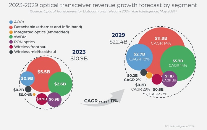 2023年,全球光收發(fā)器市場的收入從2022年的110億美元略微下降到109億美元,但由于云服務運營商和國家電信運營商對400G以上高數(shù)據(jù)速率模塊的高需求,預計該市場到2029年將達到224億美元。由于英偉達的大量人工智能基礎設施訂單和數(shù)據(jù)中心網(wǎng)絡升級到800G,預計2024年的收入增長率將達到27%。