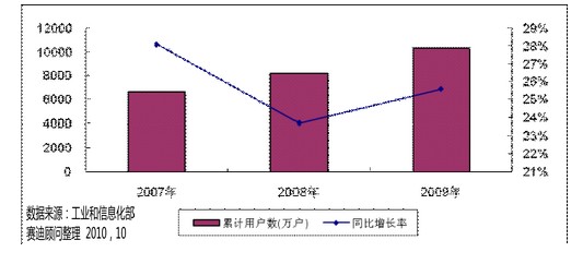 DSL仍是當(dāng)前主流寬帶接入技術(shù),DSL用戶(hù)持續(xù)快增長(zhǎng),2009年中國(guó)DSL用戶(hù)數(shù)達(dá)到8390萬(wàn)戶(hù),同比增長(zhǎng)25%。鑒于DSL原有網(wǎng)絡(luò)較為完善,新采購(gòu)設(shè)備需求有所降低,另外,DSL產(chǎn)品價(jià)格持續(xù)下降,所以使得中國(guó)DSL市場(chǎng)銷(xiāo)售量和銷(xiāo)售額都呈現(xiàn)了下降的態(tài)勢(shì)。