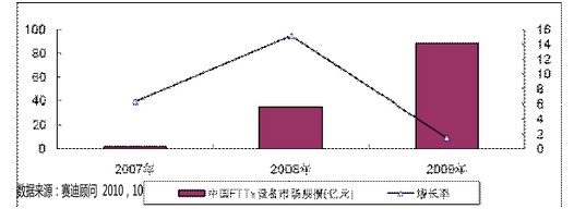 圖4 2007-2009年中國(guó)FTTx設(shè)備市場(chǎng)規(guī)模及增長(zhǎng)