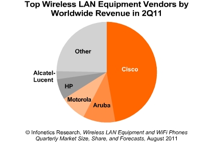 Cisco和Aruba位居無(wú)線局域網(wǎng)設(shè)備收入(排除WIFI手機(jī))的前兩名,Motorola超HP居第三。