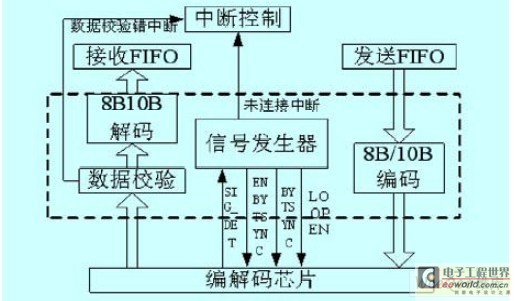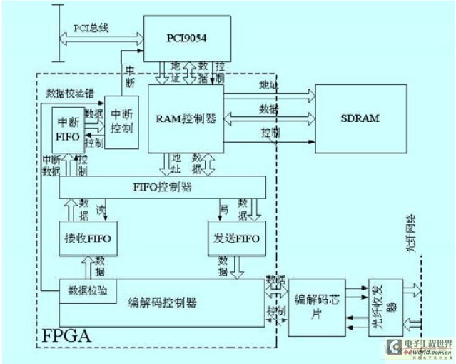 其中,F(xiàn)PGA 內(nèi)部包含SDRAM控制器和FIFO 控制器、編解碼控制器、接收FIFO、發(fā)送FIFO、中斷FIFO及中斷控制等。FPGA 選用Cyclone II 系列的EP2C35F484C7;PCI 選用PLX 公司的PCI9054,能夠提供兩個(gè)獨(dú)立的DMA 引擎,每個(gè)都可以進(jìn)行讀寫,在一個(gè)DMA 讀取數(shù)據(jù)的同時(shí)另一個(gè)DMA 可以寫入數(shù)據(jù),加快系統(tǒng)工作速度; 編解碼芯片選用安捷倫的H D M P -1636A,提供十位的并行IO,串行數(shù)據(jù)傳輸速率達(dá)1062.5MBd,負(fù)責(zé)數(shù)據(jù)串并行和并串行轉(zhuǎn)換,以便與光纖收發(fā)器內(nèi)部數(shù)據(jù)格式進(jìn)行匹配; 光纖收發(fā)器選用安捷倫的HFBR-57L5AP,支持多模光纖,串行傳輸速率達(dá)1.0625Gb/s,負(fù)責(zé)將電信號轉(zhuǎn)化為光信號, 通過光纖向下一節(jié)點(diǎn)傳輸。