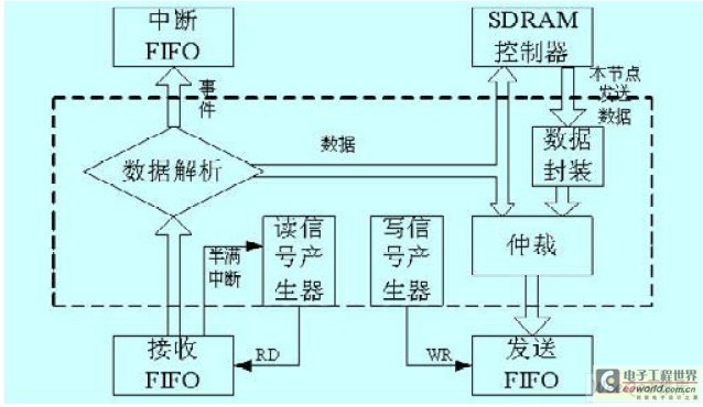 在峰值速率下進(jìn)行數(shù)據(jù)傳輸,SDRAM 存儲器很難達(dá)到要求,所以使數(shù)據(jù)經(jīng)過FIFO 緩存后發(fā)送或接收,可以降低了對存儲器傳輸速率的要求, 實(shí)現(xiàn)較高的傳輸速率。設(shè)計(jì)了FIFO 控制器,它由數(shù)據(jù)解析、數(shù)據(jù)封裝、仲裁、讀信號產(chǎn)生器、寫信號產(chǎn)生器組成。FIFO 控制器結(jié)構(gòu)如圖3 所示。