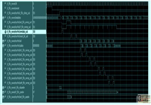 (1) 數(shù)據(jù)解析對從網(wǎng)絡(luò)中接收的數(shù)據(jù)進(jìn)行判斷,如果是中斷事件將中斷數(shù)據(jù)寫到中斷FIFO 中,如果是需要共享的數(shù)據(jù)則一部分送到SDRAM 控制器,一部分送仲裁機(jī)構(gòu);(2) 數(shù)據(jù)封裝對本節(jié)點(diǎn)發(fā)送的數(shù)據(jù)重新打包,加入數(shù)據(jù)類型、數(shù)據(jù)包長度、發(fā)送節(jié)點(diǎn)ID、目標(biāo)節(jié)點(diǎn)ID 及校驗(yàn)等相關(guān)信息,以便于其他節(jié)點(diǎn)對數(shù)據(jù)進(jìn)行解析;(3) 仲裁機(jī)構(gòu)對來自接收FIFO 的數(shù)據(jù)和本節(jié)點(diǎn)發(fā)送到數(shù)據(jù)進(jìn)行仲裁, 當(dāng)他們同時(shí)到達(dá)時(shí)來自接收FIFO的數(shù)據(jù)優(yōu)先;(4) 讀信號產(chǎn)生器在接收到半滿中斷時(shí)產(chǎn)生讀信號,從接收FIFO 中讀出相應(yīng)的數(shù)據(jù),避免FIFO 充滿或溢出;(5) 寫信號產(chǎn)生器在仲裁機(jī)構(gòu)向下發(fā)送數(shù)據(jù)時(shí)給發(fā)送FIFO一個(gè)寫信號。FIFO控制器仿真時(shí)序如圖4所示。