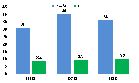 運(yùn)營商級路由器市場:一季度該市場全球銷售額為31億美元,環(huán)比下降17%,同比則下降3%;二季度該市場收入達(dá)到40億美元,收入環(huán)比增長27%,該季度能夠取得大幅增長主要是由于亞太地區(qū)強(qiáng)烈需求的帶動;三季度運(yùn)營商級路由器市場收入為36億美元,環(huán)比下降了10%,同比上升7%。