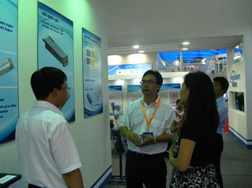 劉總向筆者介紹,旭創(chuàng)科技此次光博會展示了10G XFP系列、10G SFP+ Ethernet系列和10G SFP+ Sonet三大系列產(chǎn)品,每個系列都包括了從傳輸300m的SR一直到傳輸80km的DWDM產(chǎn)品,覆蓋了客戶在這三種應(yīng)用中除了tunable 的全部應(yīng)用。此外,旭創(chuàng)科技還展出了40G解決方案,其中基于電信市場的CFP封裝產(chǎn)品有300M SR4、10km LR4和結(jié)合行業(yè)最新應(yīng)用開發(fā)的40km ER4,以及基于云計(jì)算的QSFP+ AOC產(chǎn)品和SR4和LR4產(chǎn)品,這些產(chǎn)品大多領(lǐng)先業(yè)界,引來了參觀者和客戶的高度關(guān)注。值得一提的是,旭創(chuàng)科技還率先在業(yè)界做出了100G QSFP+的技術(shù)路線圖,非常符合客戶們的云計(jì)算發(fā)展路線,他們給予了很高的關(guān)注和期待。