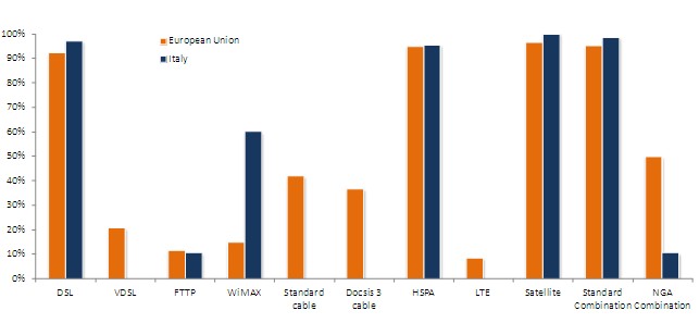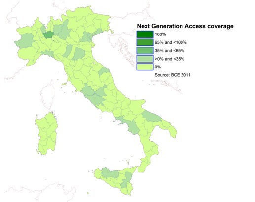 《2011歐洲寬帶覆蓋》調研報告顯示,意大利基本寬帶(至少提供144kbps的服務,只要他們愿意)家庭覆蓋達到99%,超高速寬帶覆蓋接近11%(也稱為NGA,即下一代接入)。在調研的29個國家中(歐盟27國和挪威、冰島),96%能夠獲得基本寬帶,超過50%(一半國家走向2020數(shù)字天堂目標)能夠獲得超高速。