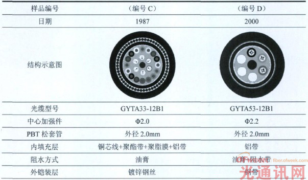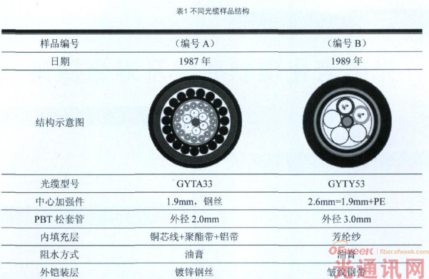 根據(jù)應(yīng)用需求不同,光纜結(jié)構(gòu)有很大的差別。本文重點(diǎn)研究在網(wǎng)運(yùn)行10-25年的層絞式室外光纜。光纜樣品長(zhǎng)度均為200m左右,外觀基本完整,具體光纜結(jié)構(gòu)及信息如表1所示。