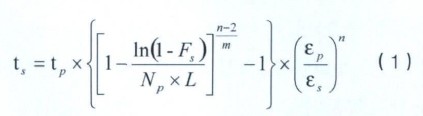 式中,ts為光纖預(yù)期壽命時(shí)間(秒);tp為光纖復(fù)繞篩選時(shí)施力時(shí)間,一般為1秒;FS為光纖斷裂概率;Np為光纖復(fù)繞篩選時(shí)每公里斷裂次數(shù)(1/km);L為所考慮光纜線路中光纖總長(zhǎng);εp為光纖復(fù)繞篩選應(yīng)變;εs為光纖服務(wù)期間所受應(yīng)變;m為光纖韋伯爾分布曲線斜率;n為光纖靜態(tài)疲勞參數(shù)。