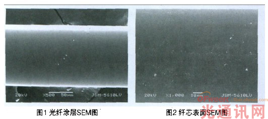 對(duì)A、B、C、D光纜不同顏色的光纖進(jìn)行拉斷力測(cè)試(如表2所示),結(jié)果表明光纖拉斷力與目前的光纖無(wú)明顯差別,初步表明樣品光纜中光纖不存在明顯裂紋擴(kuò)展現(xiàn)象。將光纖涂層及纖芯表面進(jìn)行掃描電鏡(SEM)分析(如圖1和圖2所示)后發(fā)現(xiàn)光纖涂層及纖芯表面均較為光滑,未發(fā)現(xiàn)明顯的裂紋擴(kuò)展現(xiàn)象。