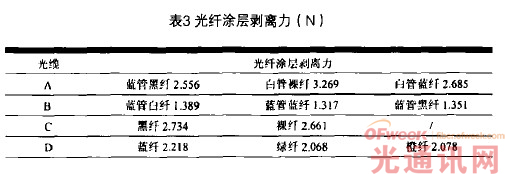由于光纖表面存在微裂紋,大氣環(huán)境中的水汽很容易侵蝕光纖,導(dǎo)致光纖自身的抗疲勞參數(shù)大大下降,因此制造光纖時(shí)應(yīng)設(shè)法將石英與大氣隔離,并對(duì)光纖表面采用密封被覆技術(shù),以提高光纖靜態(tài)疲勞參數(shù)n,從而提高光纖的壽命。表3是光纖涂層剝離性測(cè)試結(jié)果,表明光纖在網(wǎng)運(yùn)行10-25年后,所研究光纜樣本涂層剝離力仍符合現(xiàn)行標(biāo)準(zhǔn)要求,沒有發(fā)現(xiàn)涂層老化現(xiàn)象。