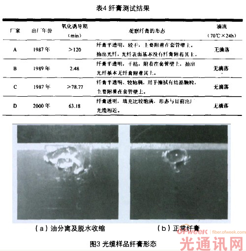 纖膏的一個(gè)基本物理性能要求是不應(yīng)出現(xiàn)油分離和脫水收縮,亦即纖膏在使用溫度范圍內(nèi)和壽命期中應(yīng)保持均勻分散體的能力。如表4及圖3所示A、B、C光纜使用二十多年后,出現(xiàn)油分離及脫水收縮,纖膏中基礎(chǔ)油滲出,固液分相,光纜兩端套管纖膏稀少甚至干涸,油膏出現(xiàn)凝膠現(xiàn)象,這將導(dǎo)致光纖松套管中有的地方?jīng)]有油膏,有的地方則油裔結(jié)塊,松套管中的光纖在溫度變化和應(yīng)力下可能導(dǎo)致光纖微彎損耗。