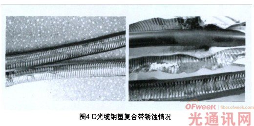 分別對(duì)A、B、C、D光纜金屬塑料復(fù)合帶進(jìn)行觀察,發(fā)現(xiàn)光纜D的鋼塑復(fù)合帶有嚴(yán)重銹蝕現(xiàn)象,如圖4所示,表明有日H2O(氣態(tài)或液態(tài))進(jìn)入光纜,引起鋼塑復(fù)合帶銹蝕。鋼塑復(fù)合帶銹蝕進(jìn)而會(huì)產(chǎn)生電化析氫,引起光纖損耗增加,影響光纖長(zhǎng)期傳輸性能的穩(wěn)定性。同時(shí),鋼塑復(fù)合帶的銹蝕表明光纜滲水保護(hù)被破壞。光纜滲水保護(hù)主要分為兩部分: 1)橫向滲水保護(hù)。在潮濕的環(huán)境中,光纜外的潮氣或水分會(huì)穿過(guò)護(hù)套向光纜內(nèi)滲透和遷移。通常采用縱包鋁帶或鋼帶結(jié)構(gòu)等方法,防止橫向滲水。2)縱向滲水保護(hù)。由于光纜保護(hù)層的局部破損或光纜連接處的意外滲水等原因,水分侵入光纜會(huì)沿著縱向滲透。通常采用填充光纜油膏等方法,防止縱向滲水圈。選取D光纜不同段進(jìn)行縱向滲水試驗(yàn),超過(guò)168h未滲水。檢查光纜護(hù)套完整情況,發(fā)現(xiàn)所測(cè)光纜護(hù)套無(wú)嚴(yán)重?fù)p傷。推測(cè)鋼塑復(fù)合帶銹蝕的主要原因?yàn)?1)潮濕環(huán)境中光纜外潮氣或水分穿過(guò)護(hù)套向光纜內(nèi)滲透和遷移;2)光纜兩端接頭密封不嚴(yán),或其他段護(hù)套破損,水沿著鋼塑復(fù)合帶搭接縫緩慢縱向流動(dòng),造成銹蝕。