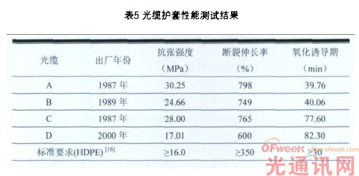 A、B、C、D光纜護(hù)套性能測(cè)試結(jié)果如表5所示。可見,A、B、C、D光纜樣品護(hù)套材料均超過(guò)了HDPE(高密度聚乙烯)護(hù)套成品出廠的技術(shù)要求,說(shuō)明光纜雖經(jīng)過(guò)10-25年的使用,護(hù)套的性能依然完好,并能繼續(xù)長(zhǎng)期使用。