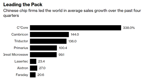 根據(jù)彭博匯編的數(shù)據(jù),在過去四個(gè)季度中,全球 20 家增長最快的芯片行業(yè)公司中,有 19 家來中國大陸。相比之下,去年同期只有 8 個(gè)。如果從增長速度的角度看,這些對芯片制造至關(guān)重要的設(shè)計(jì)軟件、處理器和設(shè)備的中國供應(yīng)商數(shù)倍于臺積電或 ASML 等大型半導(dǎo)體公司。