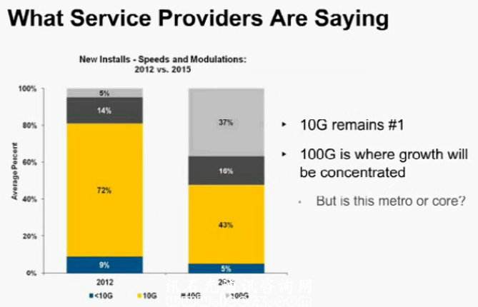 上圖顯示,2012年100G占5%,預(yù)計到2015年100G占37%。