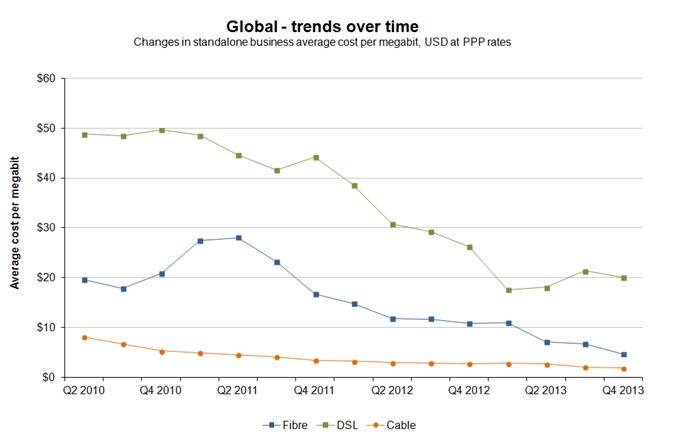 ICCSZ訊(編譯:Nina)Point Topic近日發(fā)布“全球住宅及商業(yè)寬帶服務(wù)資費(fèi)趨勢”報(bào)告。該報(bào)告顯示了從Q210到Q413期間企業(yè)和住宅寬帶服務(wù)每兆比特平均成本的變化趨勢,其中涉及的寬帶接入服務(wù)包括銅線(DSL)、Cable和光纖。