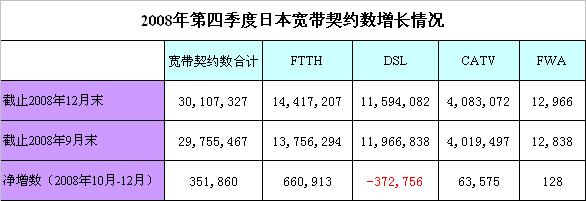 截止2008年第四季度,日本DSL寬帶接入契約數(shù)已經(jīng)連續(xù)13個(gè)季度在減少。雖然FTTH寬帶接入契約數(shù)增速放緩,但目前仍是增長最快的寬帶接入方式。