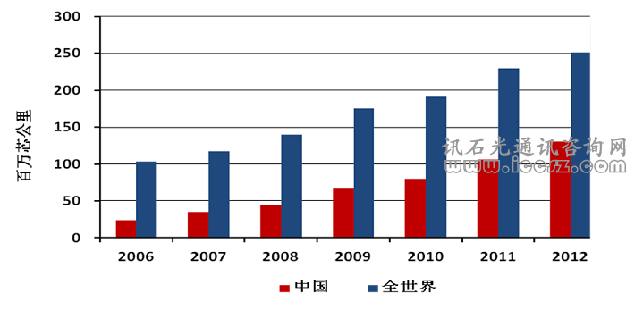 來(lái)自CRU 2013的數(shù)據(jù)顯示,截至2013年7月29日,全球鋪設(shè)已超過(guò)20億芯公里光纖,在赤道可繞地球49,900圈,或者是地球至月亮距離的5200倍;2018年將達(dá)35億芯公里。2012年全球光纖需求量大約2.51億芯公里,其中單模光纖2.48億芯公里,占總量的98.5%。