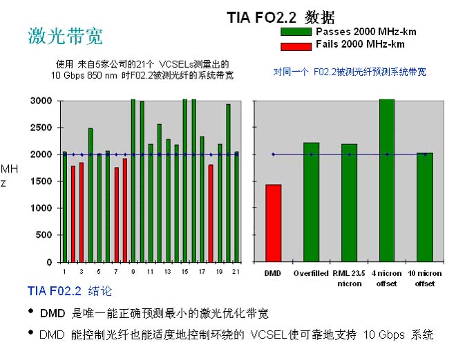 滿溢帶寬對(duì)激光發(fā)送器(通常使用于155Mb/s以上的應(yīng)用中)的最小帶寬性能承載能力較小,因?yàn)檫@些發(fā)送器的啟用條件相差甚遠(yuǎn),且通常無滿溢條件。RML帶寬也遭遇同樣的問題。開發(fā)RML實(shí)驗(yàn)的研究得出的結(jié)論僅適用于62.5µm光纖,只有當(dāng)與滿足特定啟用條件的發(fā)送器一起使用時(shí)才有效。沒有任何一項(xiàng)應(yīng)用采用這些啟用條件,研究顯示不滿足啟用條件的發(fā)送器普遍存在。最后,依賴對(duì)少部分光纖進(jìn)行試驗(yàn)而得出的結(jié)論,無法證明制造商知道該如何選擇優(yōu)良的性能。您必須提出質(zhì)疑。以下來自 TIA F02.2的測試數(shù)據(jù)和結(jié)論可以清楚地看到同一根光纖采用RML或其他的方法得到的帶寬可能遠(yuǎn)超過2000 MHz-km,但其DMD激光帶寬則更本達(dá)不到2000 MHz-km。