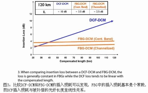 另外,DCF的插入損耗與需要補償?shù)拈L度接近呈線性的關(guān)系,而在FGB中,插入損耗幾乎是常數(shù)(圖3)。
