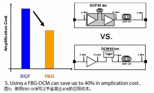 在某些情況下,利用FBG-DCM的低插入損耗性能實現(xiàn)簡單的內(nèi)嵌方法實際上可以取消這些網(wǎng)絡(luò)中使用的中段接入放大器。如果在網(wǎng)絡(luò)中能夠完全實施這樣的策略,那么與放大器相關(guān)的每跨段成本節(jié)省可達40%(圖5)。
