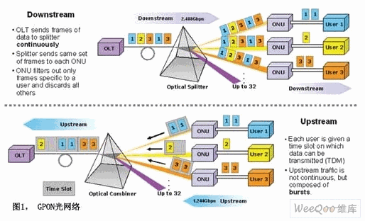 GPON是時(shí)分復(fù)用(TDM)系統(tǒng),基于現(xiàn)存設(shè)施的再使用,從遠(yuǎn)端傳送數(shù)據(jù)時(shí),時(shí)隙分配給了終端用戶。如圖1所示,在GPON中有兩個(gè)主要的數(shù)據(jù)流。下行方向從OLT(光線路終端,Optical Line Terminal)到光分路器,傳播數(shù)據(jù)到多個(gè)ONU(光網(wǎng)絡(luò)單元,Optical Network Units)。在上行方向,這個(gè)過程相反。給每個(gè)用戶(ONU)分配一個(gè)時(shí)隙以便傳送數(shù)據(jù),隨后在單根光纖上與其它數(shù)據(jù)結(jié)合在一起發(fā)送到中央辦公設(shè)備(OLT)。ONU是互相分開的,ONU源數(shù)據(jù)是由突發(fā)數(shù)據(jù)組成的,由于多個(gè)ONU的不同光長度,在上行數(shù)據(jù)里內(nèi)部的相位有變化,并將發(fā)生沖突。OLT的挑戰(zhàn)是修正每個(gè)ONU的排列,并確保在上行光鏈路中每個(gè)突發(fā)數(shù)據(jù)同步。