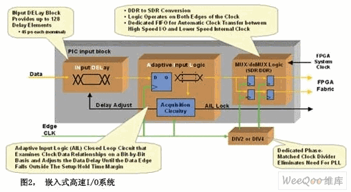 如圖2所示,嵌入在每個(gè)I/O中的是輸入延時(shí)塊(INDEL)和自適應(yīng)輸入邏輯(AIL),動(dòng)態(tài)地補(bǔ)償時(shí)序相位變化,使每個(gè)引腳的速度達(dá)2Gbps。終端的結(jié)果是完整的I/O系統(tǒng),支持快速鎖定時(shí)間和傳統(tǒng)BMR的性能,但具有很高的集成度,而且是低功耗的編程平臺(tái)。