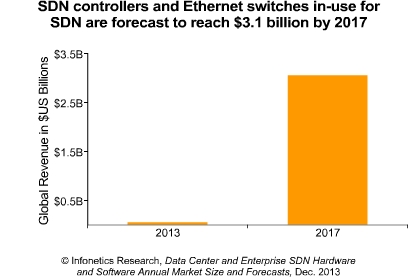 Infonetics 數(shù)據(jù)中心和云首席分析師Cliff Grossner稱:“誰都想知道——SDN真正的市場在哪里。現(xiàn)在說還為時(shí)過早,但我們最近兩年的研究表明SDN控制器和以太網(wǎng)交換機(jī)在未來用于企業(yè)和數(shù)據(jù)中心將發(fā)揮重要作用,預(yù)計(jì)該市場到2017年將達(dá)到31億美元。”