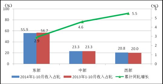 圖10 2014年10月東、中、西部電信主營業(yè)務(wù)收入同期比較
