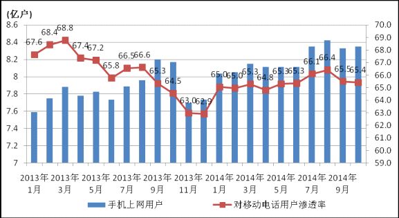圖4 2013-2014年手機(jī)上網(wǎng)用戶和對移動(dòng)電話用戶滲透率情況