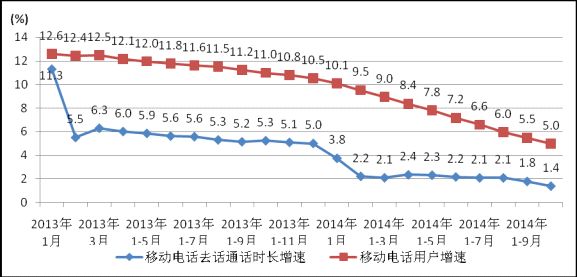圖5. 2013-2014年各月移動(dòng)話音業(yè)務(wù)量和移動(dòng)用戶同比增長比較