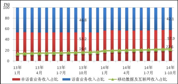 圖9 2014年10月電信主營業(yè)務(wù)收入構(gòu)成(固定和移動(dòng))