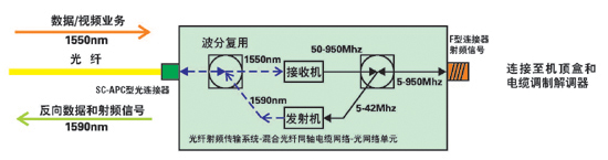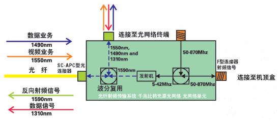 光纖連接至安裝在用戶住所的微型光站,后者負責(zé)將光信號轉(zhuǎn)換成可以在用戶的家庭網(wǎng)絡(luò)中傳輸?shù)男盘???梢酝ㄟ^同軸電纜將視頻業(yè)務(wù)傳輸至機頂盒,并將語音和數(shù)據(jù)業(yè)務(wù)傳輸至嵌入式媒體終端適配器(eMTA),后者再通過用戶家中的電話線連接至模擬電話系統(tǒng)或者通過以太網(wǎng)或WiFi 端口連接至PC 。通過采用1310nm或1590nm波長的反向通道,將語音、數(shù)據(jù)和視頻業(yè)務(wù)傳輸至接收平臺,再由后者轉(zhuǎn)換光信號并將之發(fā)送回CMTS。