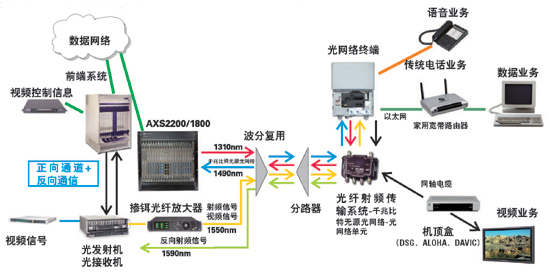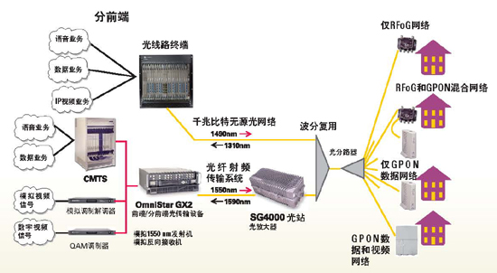 微型光站負責(zé)將所有的反向通道業(yè)務(wù)轉(zhuǎn)換成光信號,并在1590nm波長上將之發(fā)送至前端。前端部署的光接收機再對這些信號進行轉(zhuǎn)換并通過CMTS系統(tǒng)將之發(fā)送至語音、數(shù)據(jù)和視頻網(wǎng)絡(luò)。這種解決方案允許有線電視運營商部署“混合式系統(tǒng)”,以同時支持GPON和DOCSIS業(yè)務(wù)。