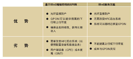 下表總結(jié)了RFoG解決方案和基于RFoG增強特性的GPON方案的優(yōu)勢和劣勢。