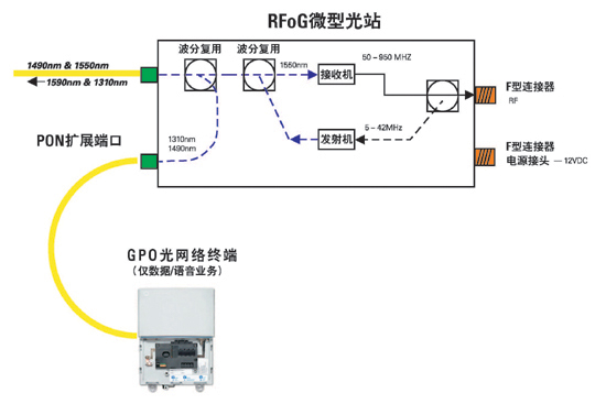 開始時,有線電視運營商將部署一臺具備PON光擴展端口的RFoG微型光站。圖6為微型光站框圖。PON專用波長1490nm和1310nm將被路由至擴展端口。當(dāng)有線電視運營商需要向特定家庭提供更多超寬帶業(yè)務(wù)時,如高速對稱數(shù)據(jù)業(yè)務(wù)或IPTV業(yè)務(wù),可以將一臺GPONONT連接至擴展端口。只要需要,仍然可以利用該RFoG微型光站來提供傳統(tǒng)的視頻業(yè)務(wù)和處理已有的反向信號。