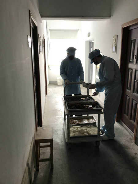 在隔離宿舍區(qū)門口,記者看到了一道新鑄造的鐵門,門上粘貼著規(guī)整的非隔離人員出入表格,鐵門旁則放著一輛餐車與幾套防護(hù)服,供送餐員工使用。