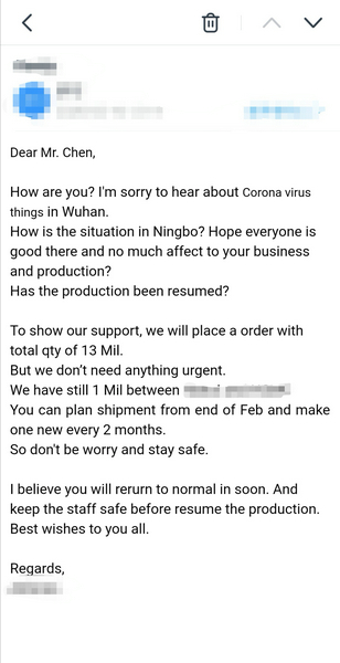 “對于近期的武漢新冠肺炎事件,我們感到十分遺憾……為了表示我們的支持,我們將會下一份產(chǎn)品總數(shù)在1300萬件的訂單。不用著急趕工,我們自己的倉庫內(nèi)還有一百萬件的貨物應(yīng)急。不用擔(dān)心,注意安全?!?
