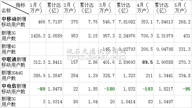 ICCSZ訊(編輯:Debi)截至6月20日,三大運營商5月運營數(shù)據(jù)均已公布,中國移動的新增用戶依舊獨領(lǐng)風(fēng)騷,中國聯(lián)通、中國電信的移動用戶增速放緩,難以望其項背,尤其是中國電信,凈增用戶為負95萬戶!小編不禁懷疑,在FDD牌照遙遙無望的今天,聯(lián)通電信尚能飯否?莫非果真已進入“存量”競爭,只有FDD才能見效?
