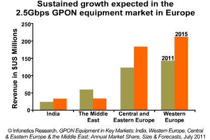 l Infonetics公司預(yù)計(jì)2.5G GPON設(shè)備收入從2010年到2015年GAGR增長率在西歐為16%,中東歐為13%。