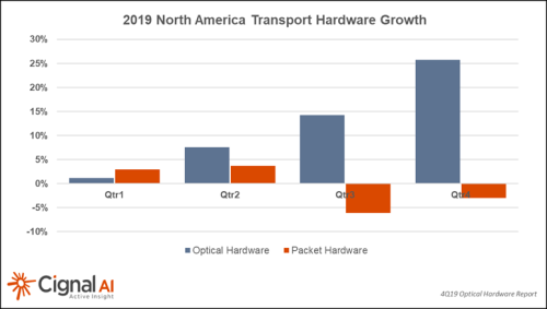 ICCSZ訊(編譯:Nina)根據(jù)研究公司Cignal AI最新的光傳輸硬件報告,近期的北美光網(wǎng)絡(luò)市場表現(xiàn)積極,2019年第四季度增長超過25%,2019年全年增長10%。