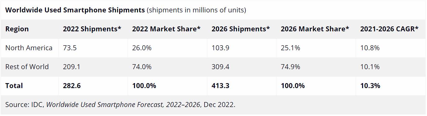 ICC訊 據(jù)IDC估測(cè),2022年全球二手智能手機(jī)的出貨量將達(dá)到2.826億部,其中包括官方翻新和二手智能手機(jī)。這比2021年的2.534億部出貨量增長(zhǎng)11.5%。IDC預(yù)計(jì)這種增長(zhǎng)將持續(xù),并在2026年將達(dá)到4.133億部,2021年至2026年的復(fù)合年增長(zhǎng)率(CAGR)為10.3%。