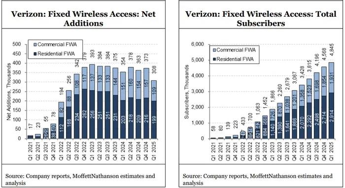 在 2025 年第一季度,Verizon 增加了 30.8 萬個 FWA 用戶,而去年同期增加了 35.4 萬個用戶,分析師預(yù)計(jì) Verizon 本季度將增加約 33.2 萬個 FWA 訂戶。其中,2025 年第一季度增加了 19.9 萬個住宅 FWA 用戶,低于去年同期的 20.3 萬個;2025 年第一季度增加了 10.9 萬個商業(yè) FWA 用戶,低于去年同期的 15.1 萬個。