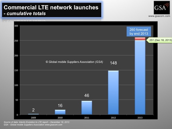 ICCSZ訊 2013年12月18日,GSA確認(rèn)到目前為止在93個(gè)國家或地區(qū)已經(jīng)有251張LTE商用網(wǎng)絡(luò)被推出。