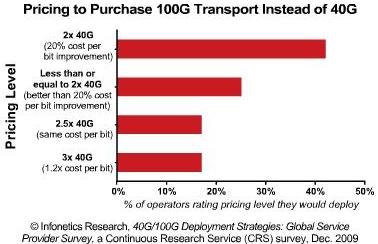 “最值得注意的意見是,一旦每比特成本改善達到20%時,運營商就會對部署40G和100G普遍感興趣,因為技術(shù)可以簡化網(wǎng)絡(luò),實在物有所值。”Infonetics研究公司光網(wǎng)絡(luò)高級分析師Andrew Schmitt說,“運營商的回答不大符合‘以上一代2.5倍成本獲取4倍性能’這一被廣泛接受的準則。不過,從10G到40G/100G的發(fā)展不同的進程;10G價格現(xiàn)在非常低,在一段時間內(nèi)依然占據(jù)著優(yōu)勢。”